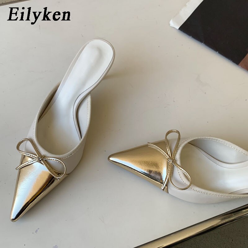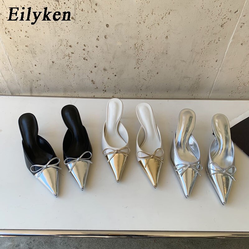 Spring New Pointed Toe Women Slipper Fashion Butterfly-knot Shallow Slip On Ladies Mules Shoes Thin High Slides